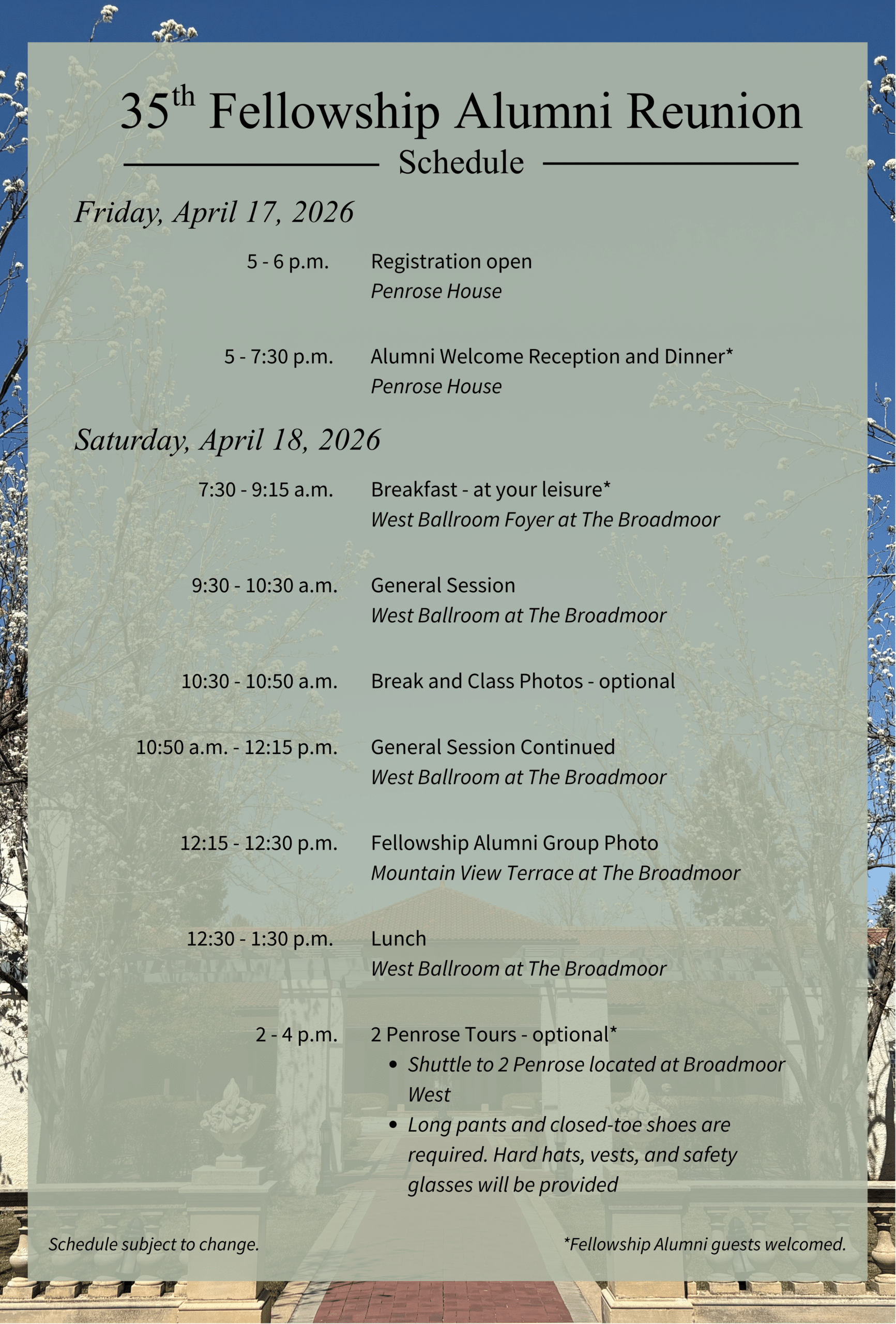 El Pomar Foundation has blocked a limited number of complimentary rooms for Fellowship Alumni for Friday and Saturday at The Broadmoor. If you are in need of hotel accommodations, reservation information is provided in the RSVP form.